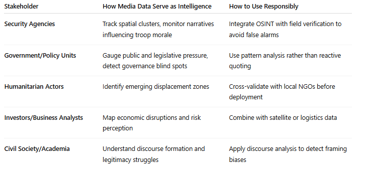 For security agencies, this layered reporting provides an open-source complement to field intelligence. The repetition of attack locations across different outlets helps identify emerging clusters. For policymakers, the narratives highlight public dissatisfaction and expose the policy gaps that drive insecurity. Humanitarian organizations rely on displacement and casualty reports to plan relief operations, while researchers and civic groups use media discourse to map power relations and community resilience.