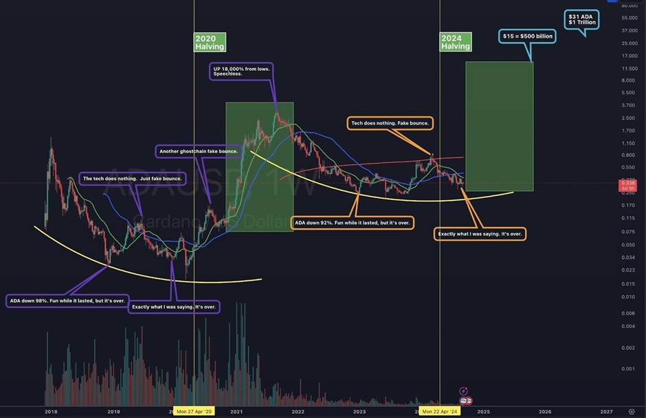 If his analysis is true and history does indeed repeat itself, ADA is very close to repeating its previous run where it spiked by 18,000% from the lows before the halving. According to Benays’ chart, ADA will realize this potential run throughout 2025, potentially reaching $15, which would place it at a $500 billion market cap.