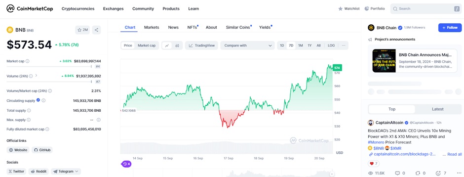 The past week saw BNB get out of the slump and increase in value by around 5.75%, reaching a price of around $573.