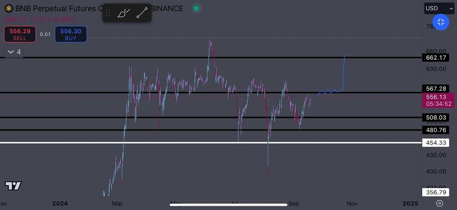 If CryptoGodJohn’s chart is anything to go by, BNB could potentially reach the $662 mark in the next few weeks. This would mark a 15.5% increase from its current price. However, if bearish traders prevail, BNB could fall below $550.