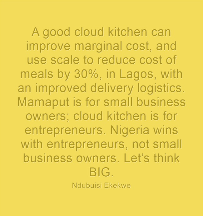 Today in Nigeria, the food delivery business is still at infancy. Even most of the food delivery apps depend on regular sit-down restaurants. A good cloud kitchen can improve marginal cost, and use scale to reduce cost of meals by 30%, in Lagos, with an improved delivery logistics. Mamaput is for small business owners; cloud kitchen is for entrepreneurs. Nigeria wins with entrepreneurs, not small business owners. Let’s think big here.