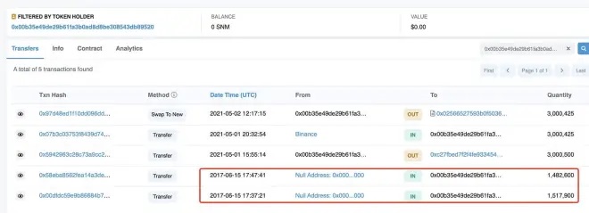 SNM ICO Participant: 0x00b35e49de29b61fa3b0ad8d8be308543db8952 spent 1,000 $ETH ($344,680 at that time) to participate in SNM ICO in 2017 and got 3M old $SNM. He provided liquidity on Uniswap and now holds 445,830 $SNM ($3.14M), worth 2,620 $ETH, he’s ROI is 262%.