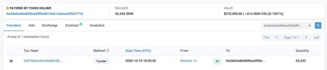 0xd3e0edbb859fea5f56e9814bd1c2ecac93b37718: bought 55,543 $SNM for ($11,307 at that time) at $0.2036 on Oct 19, 2022. According to the current price, he can get a profit of 368K, and ROI is 3300%.