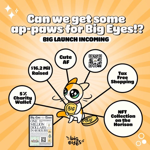 Big Eyes Coin (BIG) is a new meme coin already climbing the crypto ranks despite only being in the ninth stage of its presale. Meme coins are online jokes that have been reimagined as various cryptocurrencies, or, in the instance of Big Eyes Coin, a cute cat coin standing out in a sea of dog coins. It has already raised $16.4 million and this is only growing by the minute.