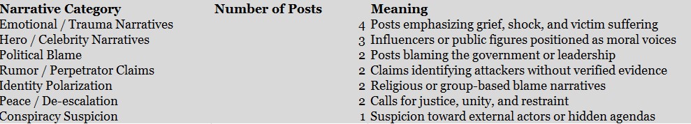 Despite these polarizing dynamics, there are also voices promoting restraint and unity. Some posts emphasize the need for lawful investigations, warn against retaliatory attacks, and encourage communities to reject rumors and collective blame. These perspectives represent an important counterforce within the digital landscape. Peace oriented messaging can reduce the space for manipulation and remind audiences that justice and accountability must occur through credible institutions rather than emotional reactions.