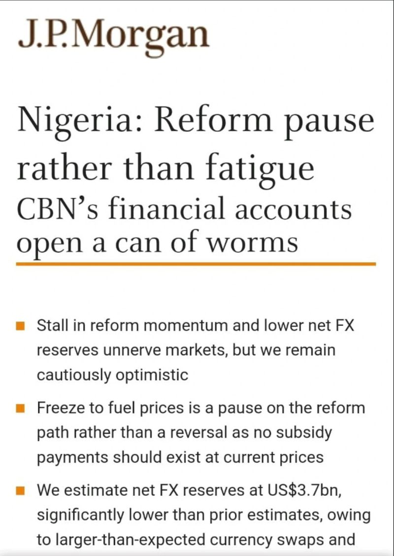 Nigeria’s bad – Net FX reserves are “significantly lower” than previously estimated, according to a recent analysis by JPMorgan. The American multinational financial firm said the new information is based on partial information from the audited financial accounts of the Central Bank of Nigeria.