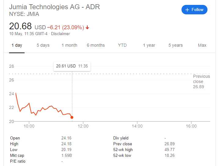 Jumia has lost 25% of its value so far today. Broadly, it has lost more than $2 billion since the IPO closing number: from total market cap of $3.9 billion to $1.59 billion now. Yet, it began from $0 and rose to $3.9 billion. Nothing has happened – we must wait to understand its trajectory after the next two quarterly earnings.