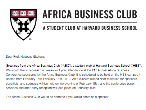 I will be speaking in Harvard in Feb 2019; just confirmed the invitation of the Africa Business Club (a student club at Harvard Business School) to speak on health during the 21st Annual Africa Business Conference.