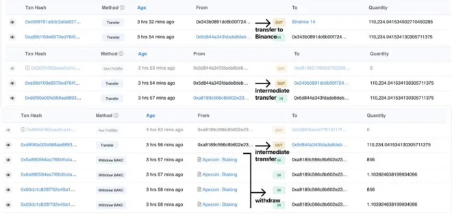 Apparently, 110k $APE ($390k) was sent to Binance six days ago. Address 0x5d844a received 104k $APE 7 months ago and has been using them for staking for the last weeks, six days ago he transferred all available $APE to Binance via an intermediate address.
