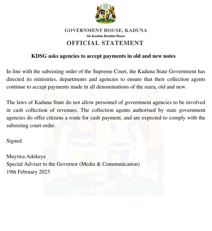 “In line with the subsisting order of the supreme court, the Kaduna State Government has directed its ministries, departments and agencies to ensure that their collection agents continue to accept payments made in all denominations of the naira, old and new.