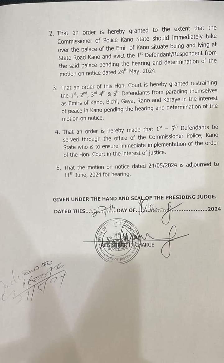 Additionally, the court ordered, “That an order is hereby granted to the extent that the Commissioner of Police Kano State should immediately take over the palace of the Emir of Kano situate being and lying at State Road Kano and evict the 1st Defendant/Respondent from the said palace pending the hearing and determination of the motion on notice dated 24th May, 2024.”