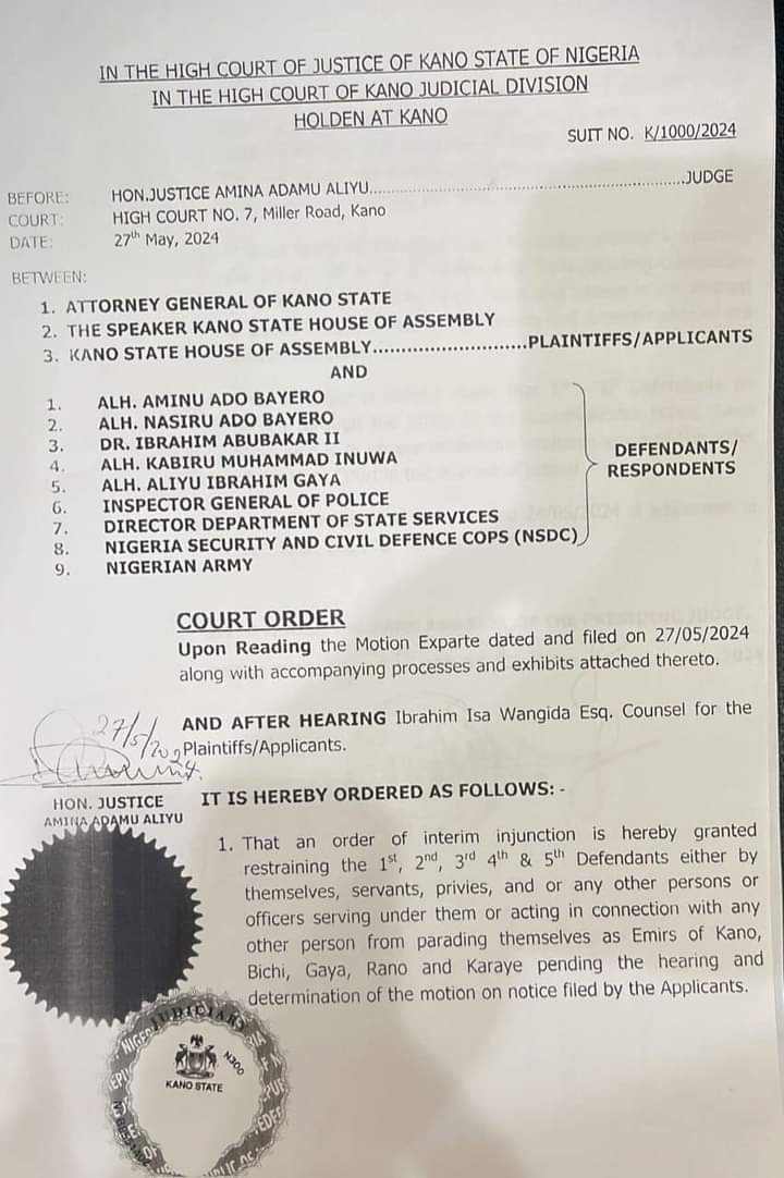 The court’s ruling is detailed in documents seen by Tekedia, where the judge granted several orders, including one that “restrains the 1st, 2nd, 3rd, 4th & 5th Defendants either by themselves, servants, privies, and or any other persons or officers serving under them or acting in connection with any other person from parading themselves as Emirs of Kano, Bichi, Gaya, Rano and Karaye pending the hearing and determination of the motion on notice filed by the Applicants.”