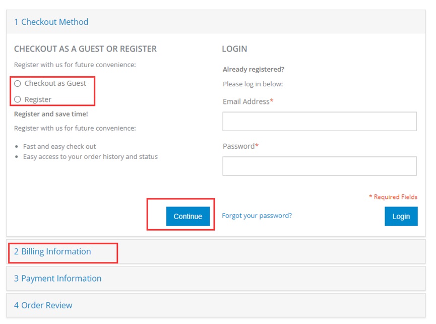 - Go to the checkout page, continue as a guest (or create an account), and then fill in “Billing Information”.