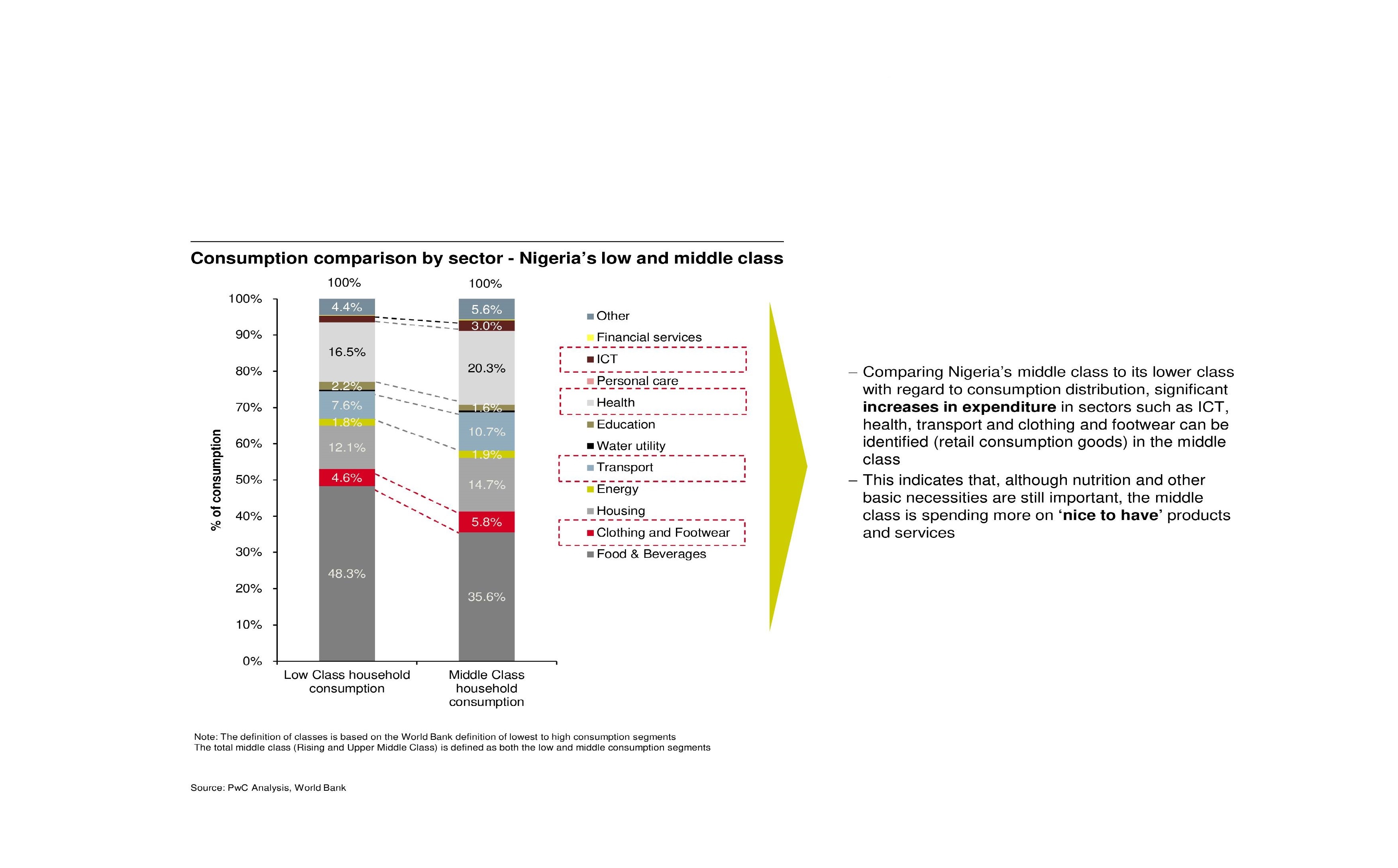 - The average number of cars per upper-middle-class household is 1.9 (around one third of upper-middle-class Nigerians have a car that is less than five years old); 60% upper-middle of homes have two cars. Car ownership remains a social symbol and prestige, among this class.
