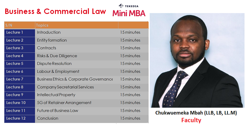In this session, Tekedia Institute Faculty Chukwuemeka Mbah explains and educates on critical components of business and commercial law, covering intellectual property, contracts, conflict resolution, labour and employment, and more. Both in the written materials and videos, our Faculty takes project leaders, business leaders, CEOs, founders, professionals and entrepreneurs on the critical mechanics of law in business.