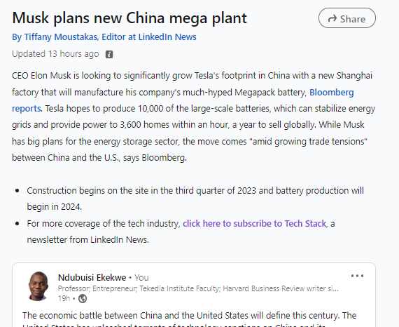 Our piece on Tesla’s new mega voyage into China was featured by LinkedIn News. Indeed, as I concluded therein that “China is rising and Tesla sees a part of its future there, and is going for it because “uwa bu ahia” (the world is a marketplace), the Igbo Nation says”, I want to invite Elon Musk to come to Abia State, Nigeria!