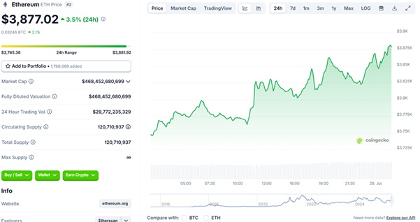 Ethereum’s price action in July has been explosive. After breaking out of a 3.7-year descending trendline and forming a bullish wedge, ETH surged from $2,090 to over $3,700, stabilizing above $3,870.