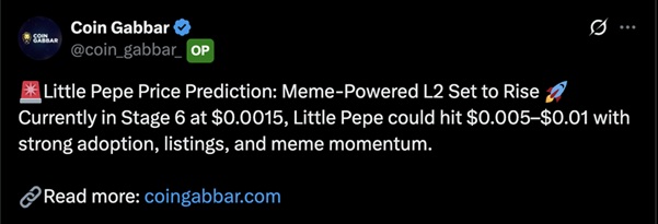 Crypto analyst @coin_gabbar_ on X (formerly Twitter) predicts that LILPEPE could hit $0.005 to $0.01 during the upcoming bull run, provided strong adoption and key listings continue. For presale investors, that means potential 20x to 50x gains, aligning perfectly with broader bullish sentiment surrounding meme coins.