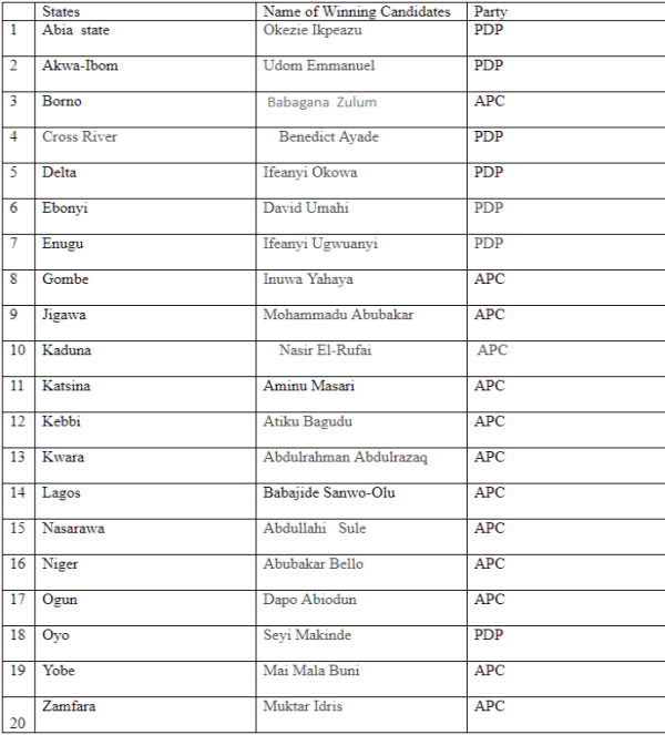 As always after the fighting, there will always be men “elected” to become governors. Here is the class starting in 2019. Governorship elections did not hold in seven states in this round: Edo, Kogi, Ondo, Ekiti, Anambra, Osun and Bayelsa. Bauchi, Benue, Sokoto, Adamawa and Plateau remain inconclusive while Rivers has election frozen. Kano, Imo (PDP) and Taraba (PDP) States yet to be called.