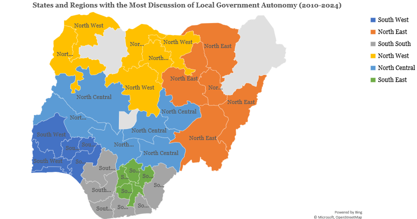 Then came 2024, the year autonomy became impossible to ignore. Discussions about local government independence spread across nearly every region, with 191 separate mentions recorded nationwide. Oyo, Lagos, Delta, Rivers, Anambra, and Ogun became hotspots of advocacy. For the first time in more than a decade, local government autonomy outpaced many other policy debates in both intensity and reach. It was no longer a side conversation. It had become a national demand.