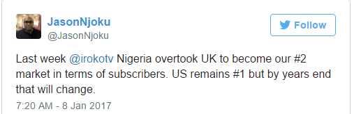 Over series of tweets, the founder of iROKOtv, Jason Njoku, informed the world that his company is outperforming in Nigeria as the country has overtaken UK in subscriber base. He also noted that U.S. has the #1 position in subscriber base, and he expects Nigeria to overtake U.S. in coming years.