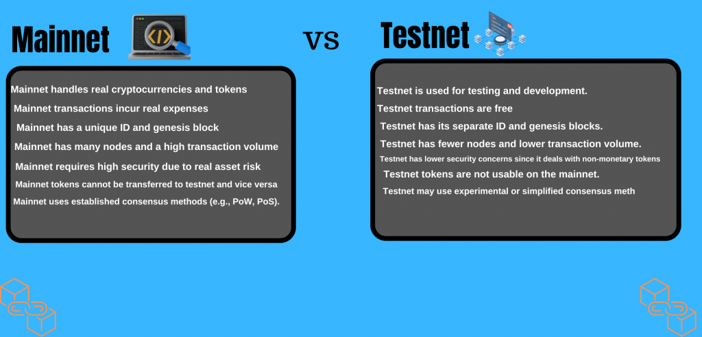 The mainnet is a fully functional blockchain network where smart contracts are executed. It deals with real cryptocurrencies or tokens with a finite amount of supply. In contrast, the testnet is a distinct blockchain environment designed for testing and development. Developers may test out new features and make enhancements without having to risk real currency.