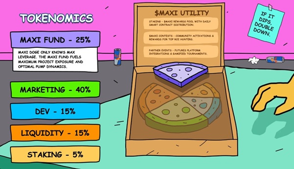 Maxi Doge has a total token supply of 150,240,000,000. The way it is allocated indicates a strong emphasis on visibility and daily activity. 40% is set aside for marketing, which includes promotions, community rewards, and outreach campaigns. 25% goes to the project’s treasury fund, meant to support growth efforts, future listings, and any strategic moves required in the months following launch.