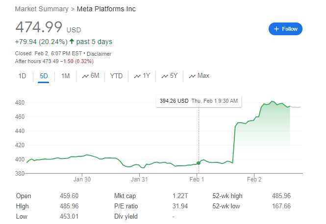 - If Meta’s stock gains hold through Friday’s trading session, it will add about $200 billion in market cap, the biggest one-day gain ever, per Bloomberg.
