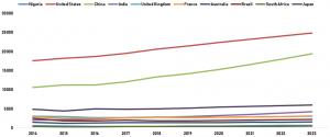 Between 2014 and 2018, Nigeria and other countries in Africa and Asia had irregular constant GDP prices growth. Within the period, it was difficult for Nigeria and South Africa to have growth similar to what was recorded by the United States of America and China [see Exhibit 1-4 for the place of Nigeria among the select countries in Africa, Asia, America and Europe]. Going forward, Nigeria is likely not to be on the par with the two countries (USA and China) because the projected constant GDP prices indicate the irregular growth rate as from 2020 [see exhibit 2].