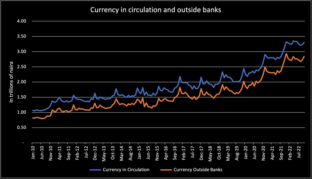 - Currency in circulation has more than doubled since 2015; rising from N1.46 trillion in December 2015 to N3.23 trillion in September 2022. This is a worrisome trend that cannot be allowed to continue.”