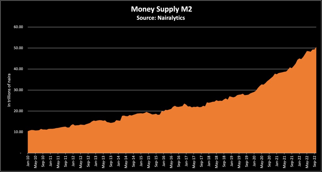 That famous writer wrote water everywhere but not a single drop to drink as he looked at the ocean. In Nigeria, I can paraphrase to money everywhere but not a single kobo for the common man or woman. Indeed, Nairametris explained it all: “Data from the central bank of Nigeria reveals Money Supply is now at a record high of N50.5 trillion as of October 2022. This is the highest level ever reported for one of the most important monetary-related statistics tracked by Nigeria’s central bank or any central bank in the world. The increase in money supply was N1.26 trillion in October alone, the third highest month after April and May this year. The amount of money supply in the country has risen by N6.1 trillion this year alone, having closed at N44.4 trillion at the end of 2021.”