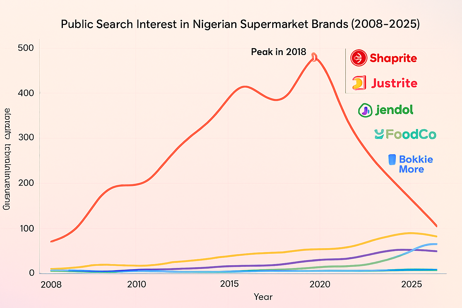 Jendol followed a similar trajectory, though it came into public consciousness later. Virtually invisible before 2018, the chain rose rapidly and achieved higher search interest than Justrite by 2024. Jendol’s appeal was its promise of value. It positioned itself as an accessible alternative for urban families looking for affordable shopping options. The trend line shows a clear hunger among Nigerians for local brands that match their daily realities.