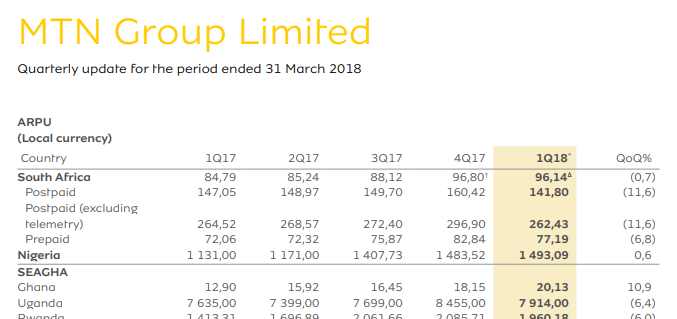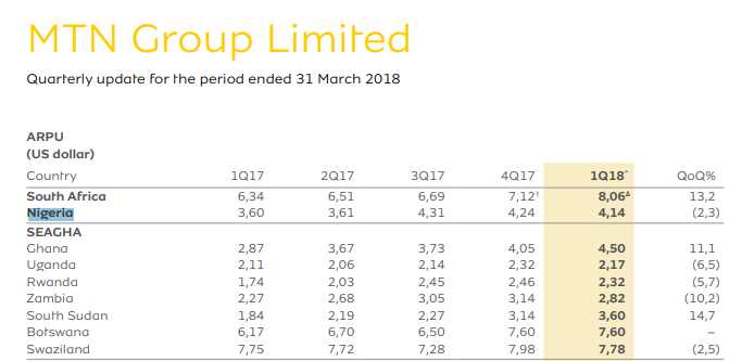 MTN Nigeria has ARPU (average revenue per user) of N1500 – about $4.14 – in Q1 2018 [see the second table below, MTN used the black market rate which makes sense as it would have had to buy dollars from the black market to ship any money from Nigeria to South Africa]. Currency fluctuation is a big issue when you look at the USD table where even though MTN Nigeria had better ARPU in Q1 2018, in Naira, the amount in USD was lower than the one recorded for Q4 2017 ($4.14 vs. $4.24)