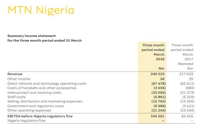 Here, relying on the Q1 2018 MTN Group financial reports, I present the extracted numbers for MTN Nigeria. MTN Nigeria made N81.4 billion (about $225.7 million using reported exchange rate) in the first quarter of 2018 on its 54.5 million subscribers.