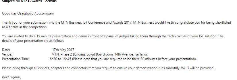 The MTN Mind2Machine Awards has shortlisted Zenvus for the finals of the IoT awards in South Africa. This is a competition that focuses on IoT and embedded systems. It was communicated via email today. Our team will attend the program through a new South African affiliate Fasmicro Group is establishing.