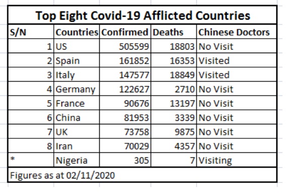 On this note, I am firmly in support of the federal government’s action in bringing over the medical team from China to come and share their experiences as part of the efforts in combating the pandemic. This is wisdom because the Chinese were able to keep their death rates below 4,000 compared to the escalating death rates of the other countries in the table. This is also an opportunity for those misinforming the public to monitor the incidences before and after the arrival of the Chinese in the country just as they did that of Italy. At this point we have to forget the fact that the Chinese may never be counted among the nicest people in the world. If warring parties in the Middle-East and elsewhere are having truce and uniting against a common enemy, how much more China with it stakes in Nigeria, Africa, and its quest for global dominance.