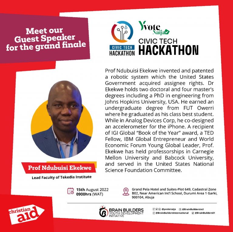 The Yvote Naija CivicTech Hackathon 2022 is an initiative of the Brain Builders Youth Development Initiative (BBYDI) with support from Christian Aid. In addition to addressing Nigeria’s major election concerns of vote buying, voter apathy, and electoral violence, it aims to explore civic-tech solutions to improve public participation in the political process.