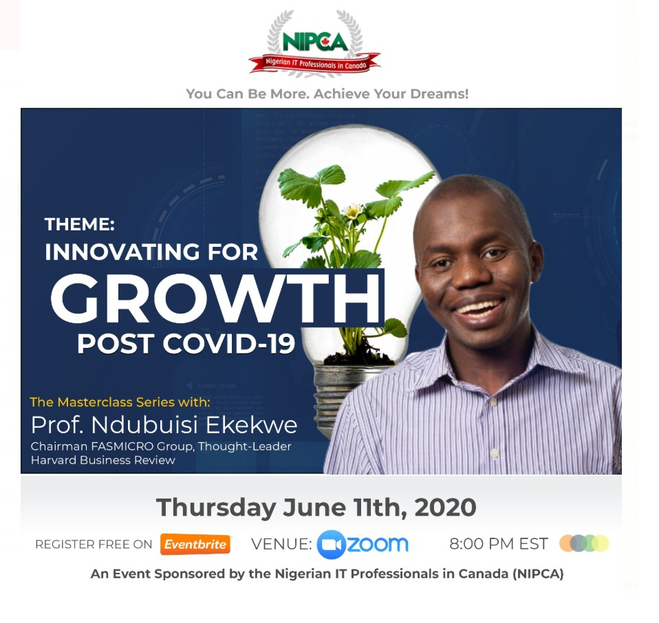 I will run a Masterclass Series for Nigerian IT Professionals in Canada (NIPCA). I have planned to spend two days with the community in Canada, but with the virus not fully managed, my travels remain frozen. The theme is Innovating for Growth within the context of post Covid-19 economy. The date is June 11. Register free here .