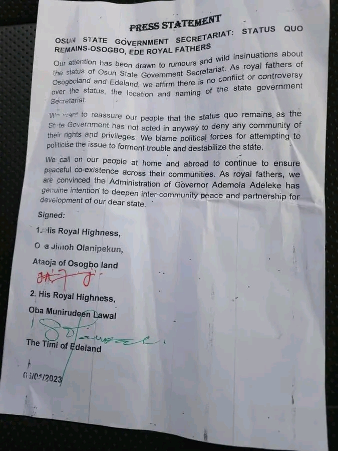 The title reads “Osun State Government Secretariat: Status Quo Remains-Osogbo, Ede Royal Fathers” Connecting “Status Quo” to the kicker (Osun State Government Secretariat), it is clear that the rulers want the public to believe that naming location of the secretariat remain Abeere Osogbo. Is the state government politically aligned with their resolution? If so, why were some of the “Abeere Osogbo” signages at the front of the secretariat recently removed? The state government should also send out messages indicating that some letterheads with Abeere but no Osogbo do not come from the government. I’m still hoping the letter heads are made up. As a result, the state government must clear citizens’ doubts.