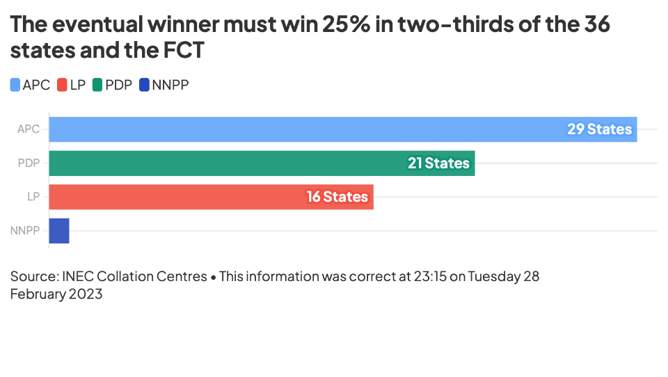 Using the results, Tinubu scored at least 25% of votes in 29 states; Atiku (21) and Obi (16). One needs at least 24 or 25 states (including Abuja). Based on that, Tinubu gets the call.