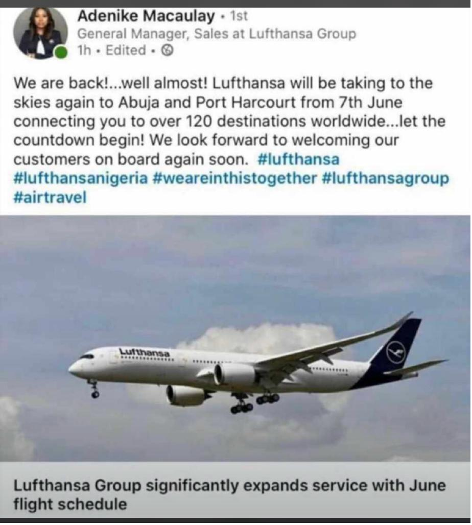 The normalization is coming. Lufthansa will fly into Abuja and Port Harcourt from June 7, 2020. But the biggest news is the grounding of Flair Aviation, a foreign carrier, by the Nigerian aviation regulator for flouting the “no flight” rules when not on humanitarian services: “COVID-19: Flair Aviation, a UK company, was given approval for humanitarian operations but regrettably, we caught them conducting commercial flights. This is callous! The craft is impounded, the crew being interrogated. There shall be maximum penalty. Wrong time to try our resolve,” Minister of Aviation, Hadi Sirika, wrote on Twitter.