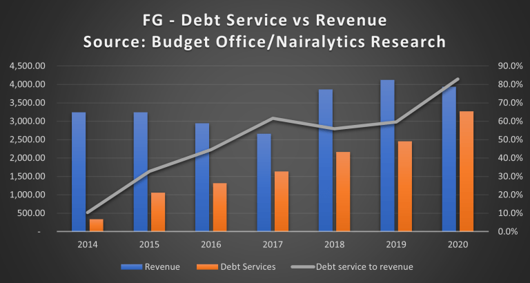 Yes, we hit a new milestone in 2020: 83% of revenue was spent on servicing debts: “total revenue earned in 2020 was N3.93 trillion representing a 27% drop from the target revenues of N5.365 trillion. However, debt service for the year was a sum of N3.26 trillion or 82.9% of revenue. Nigeria’s debt service cost of N3.26 trillion has now dwarfed the N1.7 trillion spent on capital expenditure of N1.7 trillion incurred in 2020.”