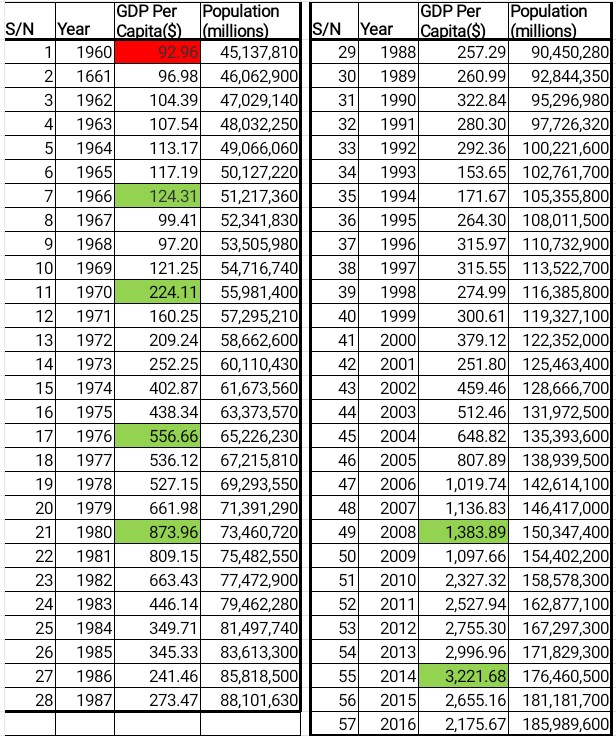In proffering an answer to the puzzle, I analyzed data on per capita GDP and population size from 1960 to 2017, a scope of 57 years, sourced from indexmundi. From the trend, Nigeria have had six optima populations since its political independence. The first was in 1966 with a population of over 60 million, the citizens enjoyed a relatively high standard of living with a per capita income of $124.31. Then we had optima in 1970, 1976, 1980, and after a quarter of a century we had another in 2008. And after five years of decline from the last optimum, the per capita income recorded an all time highest of $3,221.68 in year 2014.