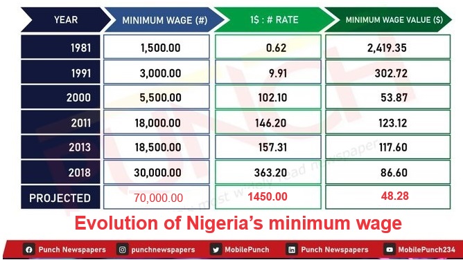 If we use the official exchange rate, the new wage is about $50 per month. Sure, a small step to get workers some support, but we have a long way to go. Why? “As of January 1, 1981, the federal minimum wage in the United States was $3.35 per hour. In other words, the monthly wage was $536 using the typical 40 hours per week. In Nigeria then, using the 1981 exchange rate since the Naira was stronger than the US dollar, it was $2,491.35 (see Punch data below). Say it in another way, the monthly minimum wage in Nigeria in 1981 was $2,491.35!”