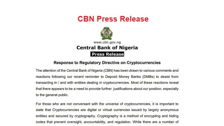 The attention of the Central Bank of Nigeria (CBN) has been drawn to various comments and reactions following our recent reminder to Deposit Money Banks (DMBs) to desist from transacting in / and with entities dealing in cryptocurrencies. Most of these reactions reveal that there appears to be a need to provide further justifications about our position, especially to the general public.