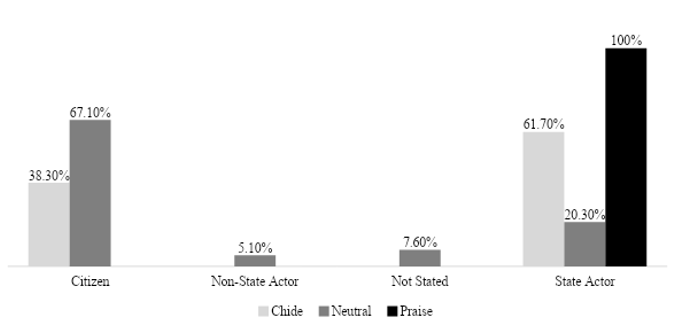 Politicians, governors, deputy governors, commissioners, ministers and security agencies were mostly referenced as state actors, while members of the civic space, social and public affairs analysts, academics, labour unions, youth organisations and activists were considered non-state actors. Thirty-nine out of the 162 quotes had traces that gave meaning to the incident. Surprisingly, our analysis shows that stakeholders could not agree on whether the incident was looting or not. Instead, a large percentage of the stakeholders considered it to be theft and vandalism. In terms of blaming and praising the stakeholders, analysis indicates that state actors were blamed more than the citizens, especially those who participated and were described by the newspapers as hoodlums (see Exhibit 2).