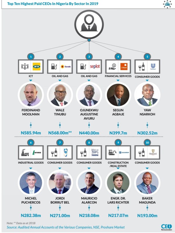 Other are: Michel Purchercos, Lafarge, ?282.38 million; Jordi Borrut Bel, Nigerian Breweries Plc, ?271 million; Mauricio Alarcon, Nestle, ?218.08 million; Lars Richter, Julius Berger, ?217.07 million; Baker Magunda, Guinness, ?193 million; and Emeka Emuwa, Union Bank, ?172 million.