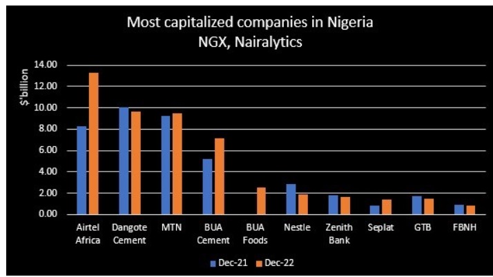 According to Nairametrics data, these are the largest public companies in Nigeria as at Dec 31 2022. Dangote Cement actually lost momentum there, possibly investors repriced it and went for BUA Cement. The founder of BUA Group is evidently a king in the market now, when you see that BUA Foods and BUA Cement are well represented.