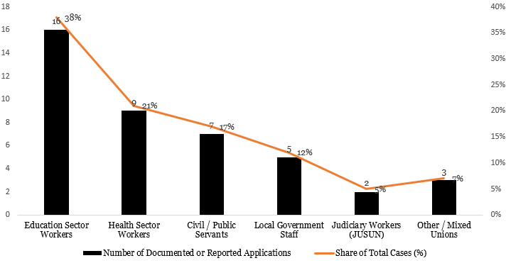 Our analysis reveals that governments at both levels invoked the controversial policy 42 times within the period. Education workers accounted for 16 of those cases, representing about 38 percent of total applications. The health sector followed with nine instances, or 21 percent, while civil servants faced the policy seven times. Local government workers were targeted in five cases, and judiciary workers twice.