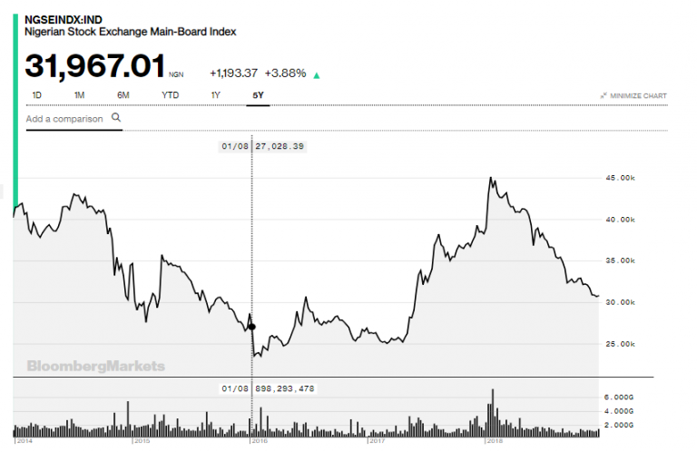 In Nigeria, the Nigeria Stock Market NSE reached an all time high of 45,092.83 in January of 2018 and a record low of 19,785.03 in December of 2011. Today, we are at 31,967.01.
